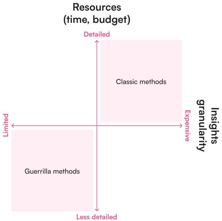 Budget is a crucial factor in the choice of user research methods. Here’s a comparison between guerrilla and conventional methods: