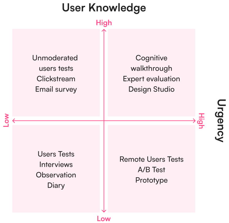 The choice of user research methods can also depend on two factors: the level of user knowledge and the urgency of the project. Positioning your project on this matrix will help you choose the most appropriate method.