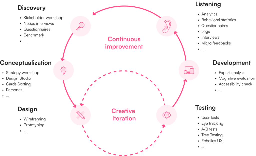 - User testing: evaluates the ergonomics and efficiency of a product by observing users in action. This method helps identify friction points and improve the user experience.