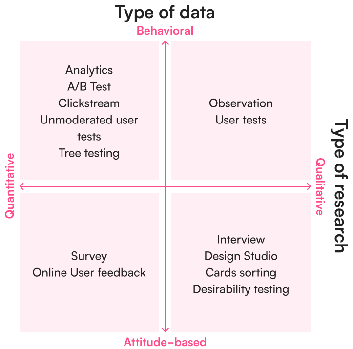User research methods can also be classified according to the type of data (quantitative or qualitative) and the type of research (behavioral or attitude-based). Here are just a few examples from each category: